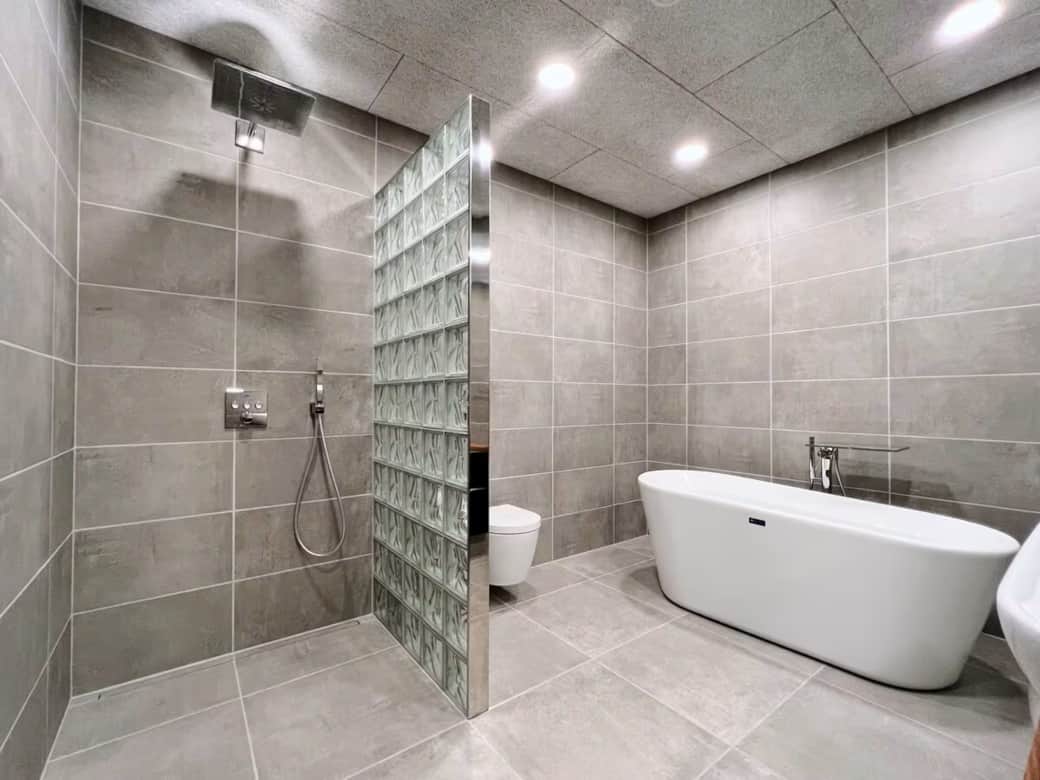 Det rummelige badeværelse byder på både badekar, håndbruser og rainshower. Der er puslebord, hårtørrer, håndsæbe og håndklæder til rådighed. Skabs- og skuffeplads samt toilet fuldender komforten.